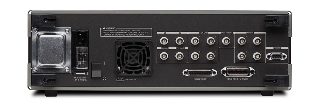 兩種儀器都有一個用戶定義的輸出,用于測量 X、R、X 噪聲、Aux 1、Aux 2 或輸入信號與外部電壓的比率。SR830 具有第二個用戶定義的輸出,用于測量 Y、Θ、Y 噪聲、Aux 3、Aux 4 或比率。SR810 和 SR830 都有以 256 kHz 更新的 X 和 Y 模擬輸出(后面板)。提供四個輔助輸入(16 位 ADC)用于通用用途,例如將輸入標(biāo)準(zhǔn)化為源強(qiáng)度波動。四個可編程輸出(16 位 DAC)提供 -10.5 V 至 +10.5 V 的電壓,并可通過前面板或計算機(jī)接口進(jìn)行設(shè)置。